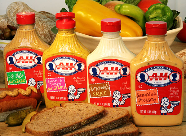 Deli Style Mustard, Sweet & Tangy Mustard, Horseradish Sauce and Sandwich Dressing.