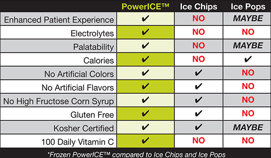 PowerICE is the easy way to keep a sick child or recovering patient hydrated, and fits into the restrictive “clear liquid diet”, which has never tasted so good — or been so good for you! PowerICE is caffeine and gluten-free, has no high-fructose corn syrup and provides essential hydration for patients on the mend. With 100% of the recommended daily value of Vitamin C, a single frozen PowerICE bar helps to replenish recovering bodies with the electrolytes they need. It is a better alternative to tasteless ice chips and the sugar-laden artificialness of jello and ice pops.